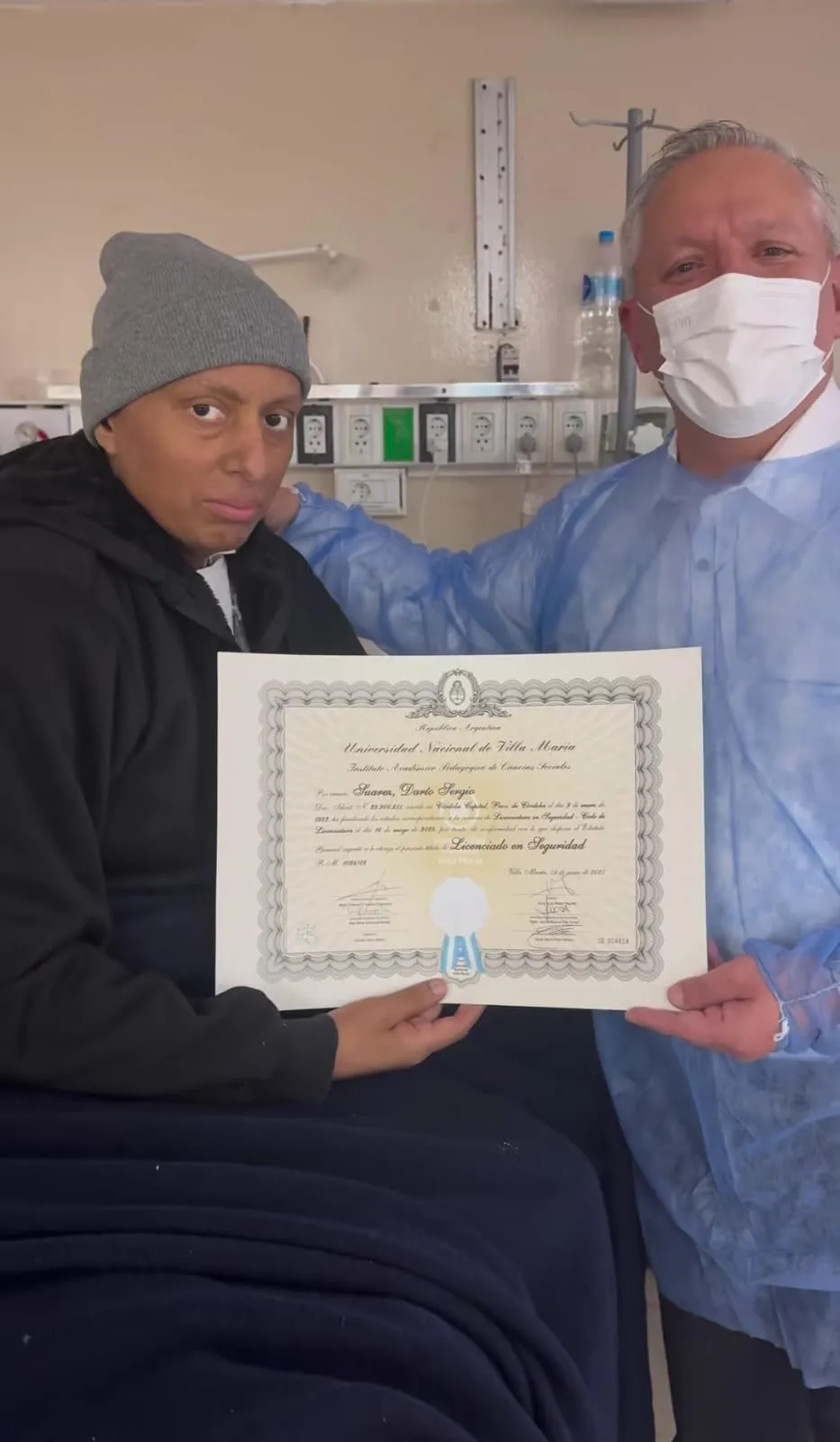 Negretti se trasladó personalmente al hospital para que Sergio pudiera recibir su título de Licenciado en Seguridad, una carrera que cursó con esfuerzo y compromiso junto a su familia. “Fue un honor poder ir al hospital Ferreyra de Córdoba a entregarlo personalmente en lo que denomina una ‘colación privada’, dándome la oportunidad de conocer a Sergio, su esposa y hermana”, expresó el rector.