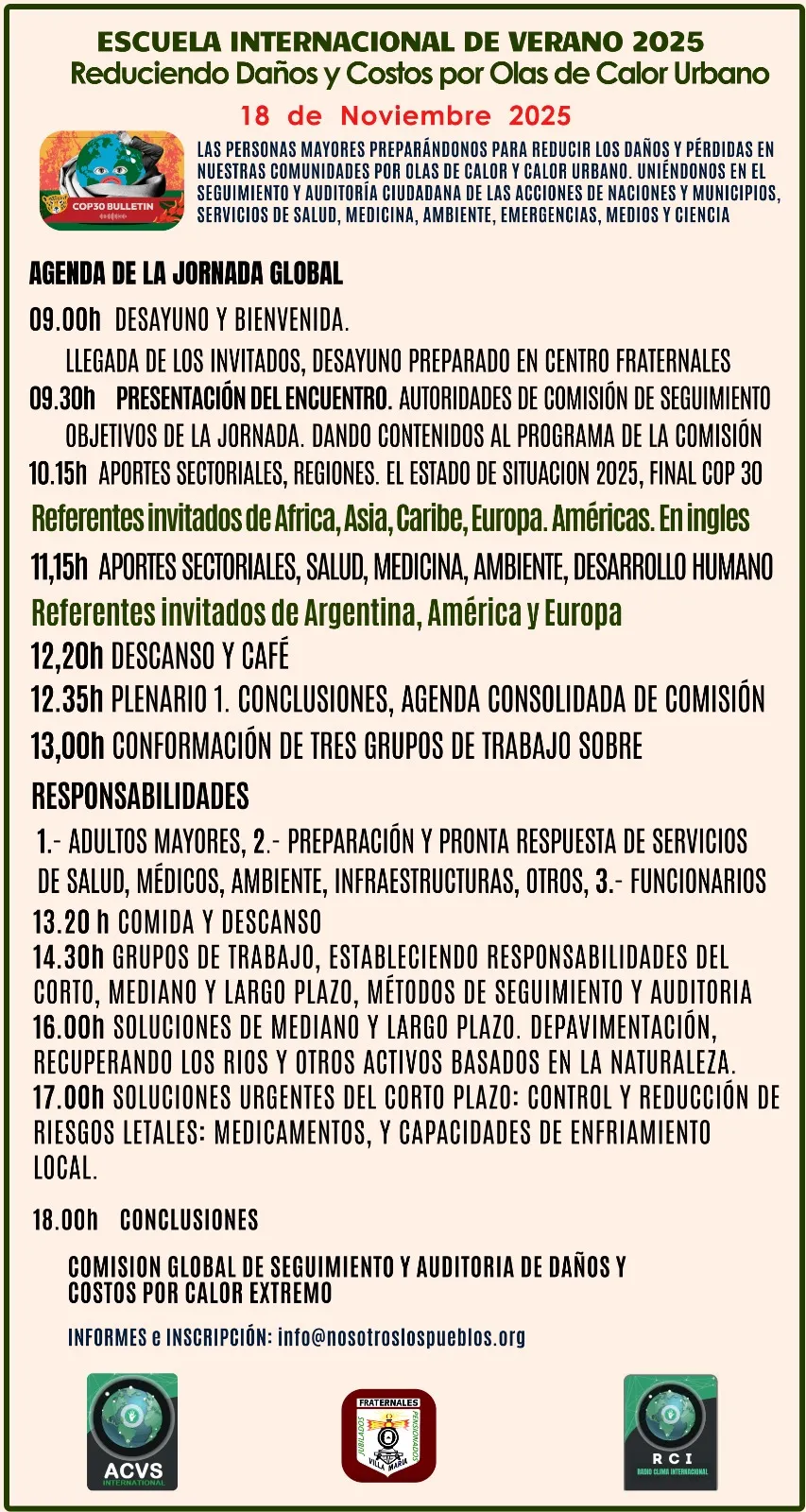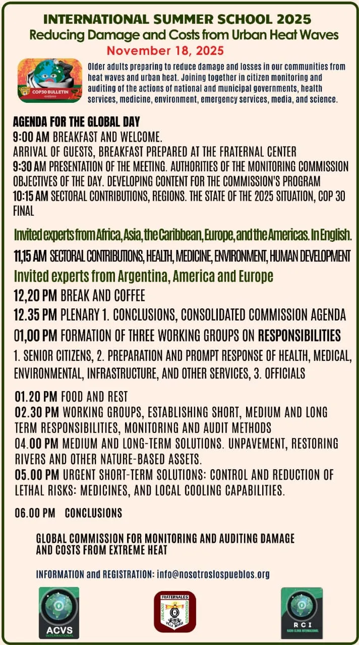 La actividad está organizada por la Comisión Global para el Monitoreo y Auditoría de Daños y Costos por Calor Extremo, junto a ACVS Internacional, Fraternales Villa María y Radio Clima Internacional (RCI). Se espera la participación de expertos y adultxs mayores de distintos continentes, en una experiencia inédita que une ciencia, sociedad y compromiso ambiental.