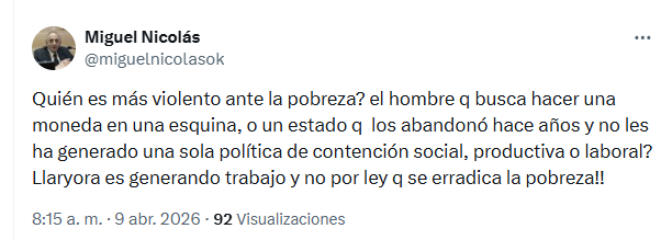 Miguel Nicolás volvió a intervenir en un debate sensible con una definición directa. En lugar de apuntar contra quien intenta sobrevivir en la calle, cargó contra un Estado que, según planteó, abandonó durante años a los sectores más golpeados sin generar políticas de contención social, desarrollo productivo ni trabajo genuino.