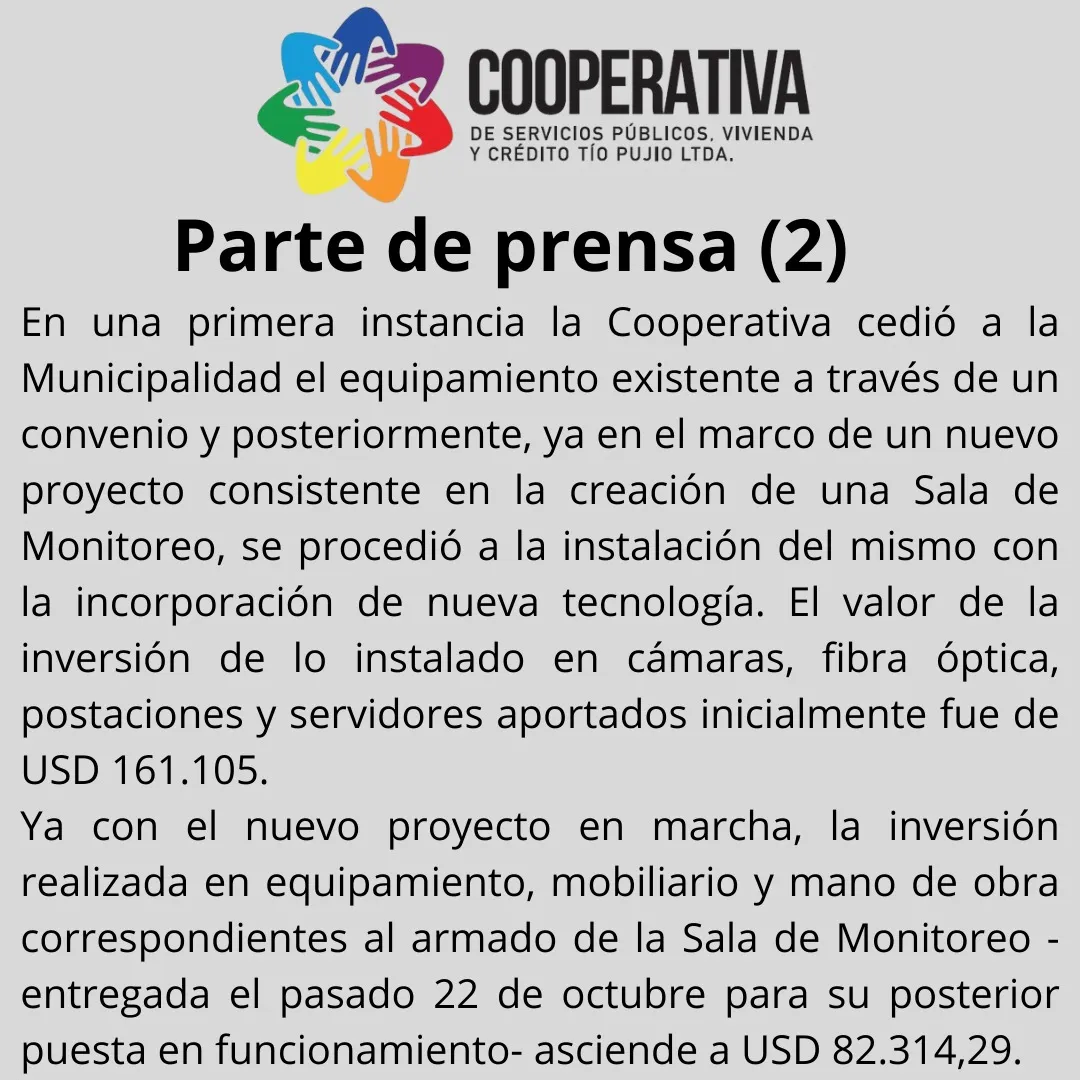 En una primera instancia, la cooperativa cedió al Municipio el equipamiento existente mediante un convenio. Más tarde, en el marco de un nuevo proyecto, se avanzó con la creación de la Sala de Monitoreo y la incorporación de tecnología actualizada. El valor del equipamiento inicial instalado en cámaras, fibra óptica, postaciones y servidores ascendió a USD 161.105.