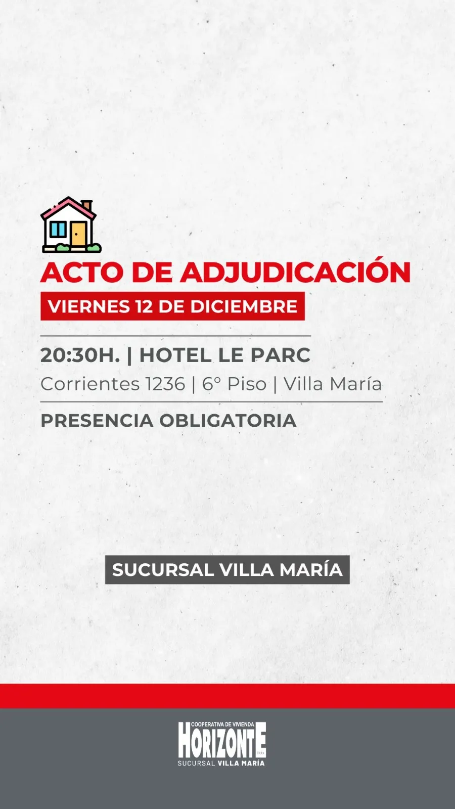 El salón del sexto piso del Hotel Le Parc volverá a llenarse con la expectativa, los nervios y la alegría que acompañan cada acto de adjudicación de la Cooperativa Horizonte. La presencia de los asociados es obligatoria porque cada entrega es un momento decisivo en el camino hacia la vivienda propia, una instancia donde el esfuerzo colectivo encuentra su recompensa.